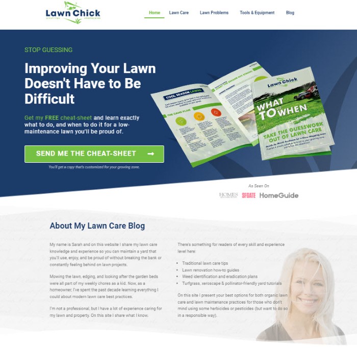 LawnChick.com is a popular lawn care blog based in Maine. It is read by over 2 million homeowners annually, and Sarah Jameson has been cited as an expert source in articles for Homes & Gardens, HomeGuide, The Sun, SFGate, Gardening Etc., and more.